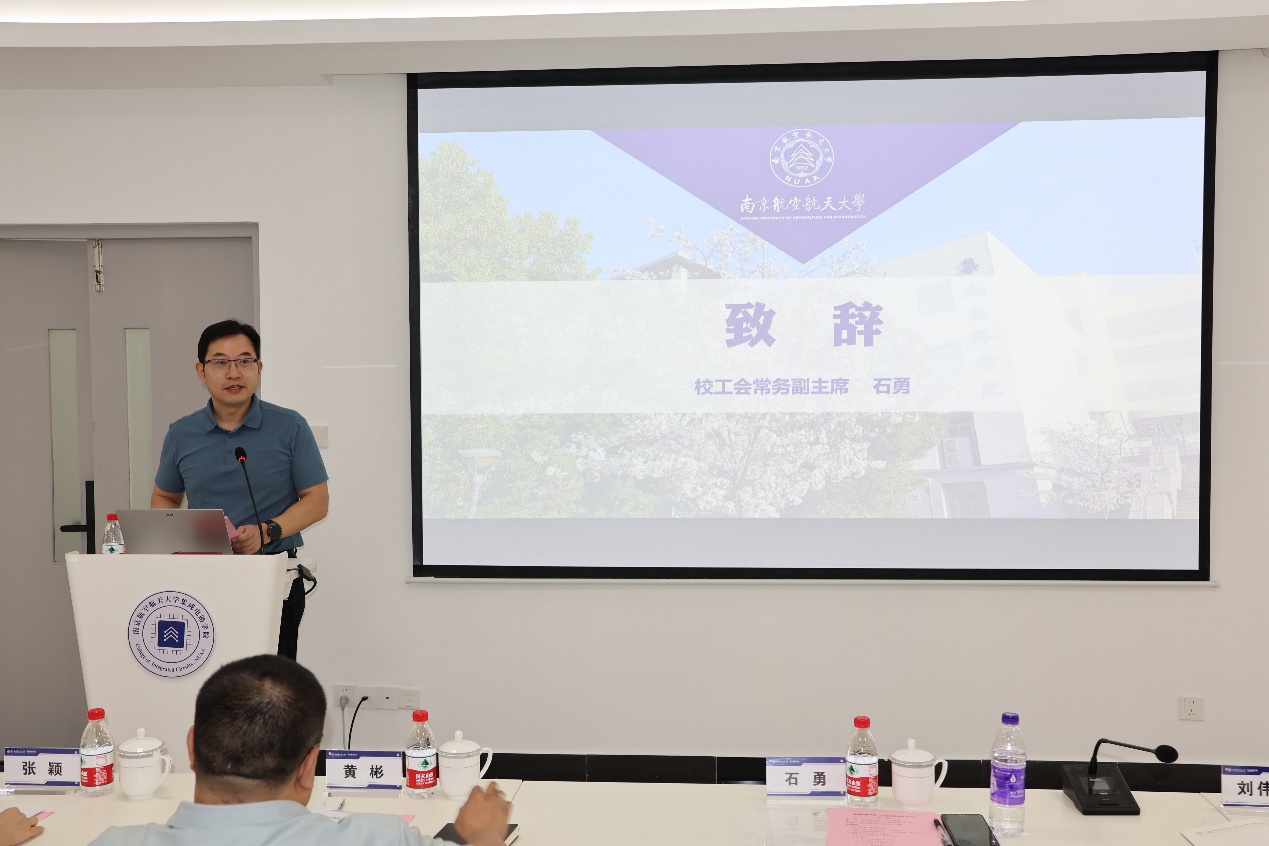 石勇代表校工会对集成电路学院工会成立大会的召开表示热烈祝贺,他指出,学院工会的成立标志着学院的民主管理和服务工作进入了全新阶段,对于更好地团结凝聚教职工、保障教职工合法权益、促进学院高质量发展具有重要意义。他强调,学院工会要提高政治站位,筑牢思想根基,团结带领全体会员自觉将个人发展融入国家航空航天民航伟大事业中;要围绕中心工作,服务发展大局,为学院搭建大平台、产出大成果提供有力支撑;要聚焦主责主业,做实服务保障,切实增强职工的归属感、幸福感和获得感;要加强自身建设,提升履职能力,努力将学院工会建设成为组织健全、制度规范、作用突出、职工信赖的先进组织。