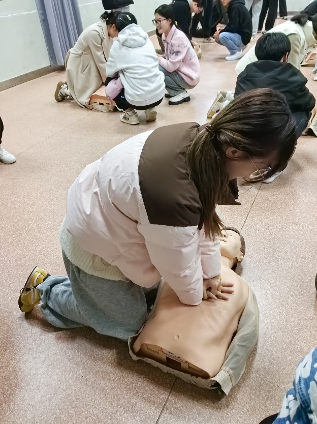 培训采用理论与实践相结合的方式,包括心肺复苏(CPR)操作、自动体外除颤器(AED)使用、气道梗阻急救等实用性强、应用面广的急救技能。在教学现场,带教老师通过大量生动的案例分析和急救演示视频等,向学员们讲授了应急救护的法律依据、基本知识、原则、操作流程,并反复强调了操作要点和注意事项。实操环节,学员们在带教老师及校医院医务人员的指导下分别进行了CPR和AED的操作练习。