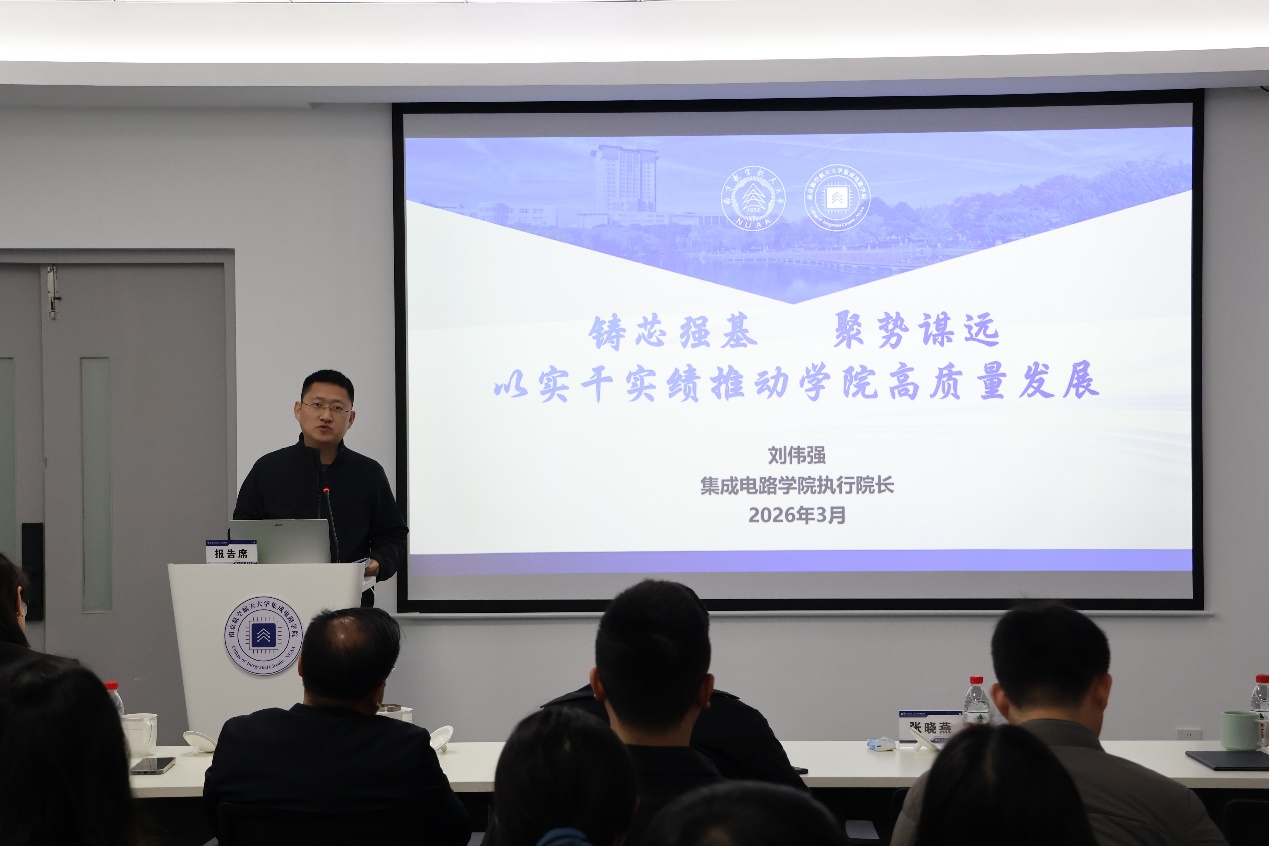 3月18日,集成电路学院召开2026年上半年教职工大会暨第四期“芯火讲堂”,学院党政领导班子及全体教职工参会。
