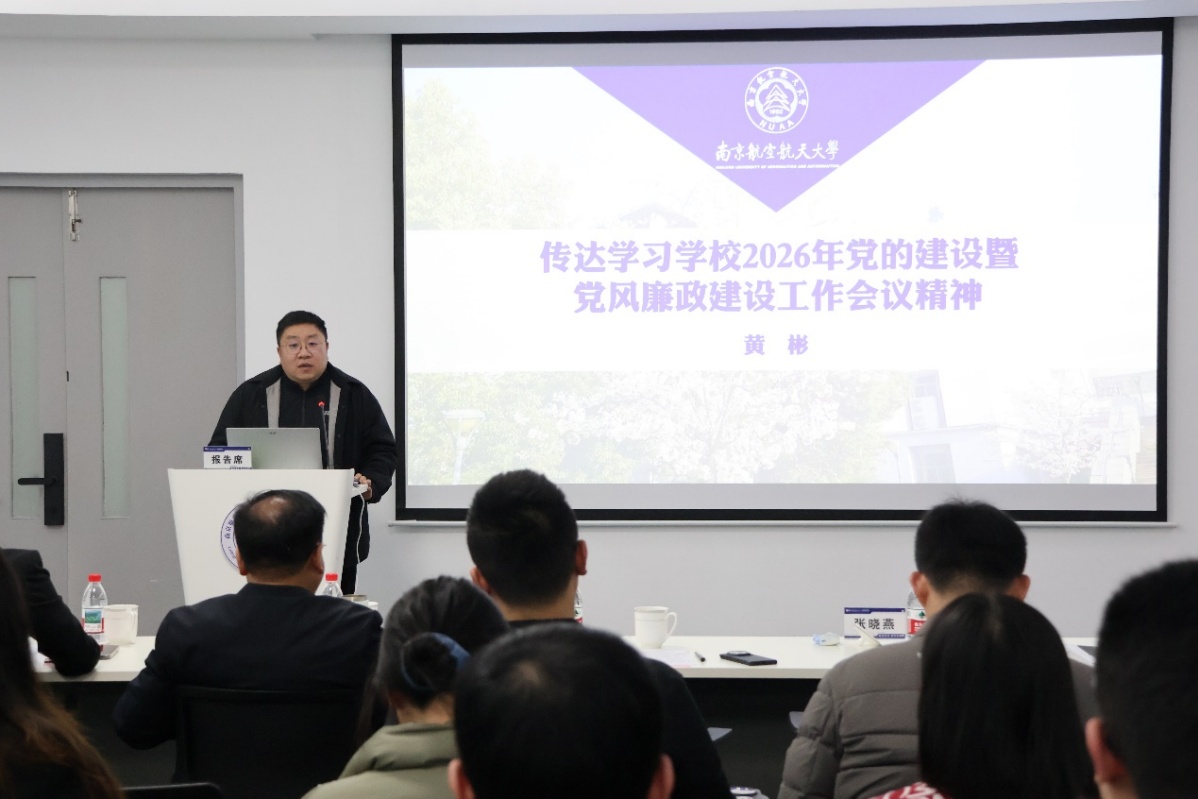会议第二阶段由学院党委副书记周聚主持。执行院长刘伟强传达了学校干部教师大会精神和《南京航空航天大学落实教育强国建设规划纲要精神行动计划(2026—2035年)》精神,并作了题为《铸芯强基,聚势谋远,以实干实绩推动学院高质量发展》的学院工作报告。他系统总结了2025年学院在学科建设、人才培养、师资队伍、科学研究等领域取得的成效,分析当前发展形势,结合“十年行动计划”关键办学指标部署2026年重点工作。他指出,一要精准对接国家重大战略需求,夯实学科平台,提高科研能力,进一步彰显三航特色、国防底色。二要牢固树立人才强院理念,坚持引育并举,着力打造结构合理、可持续发展的高水平师资队伍。三要优化人才培养体系,实施“强基跃迁”计划,推动课程教材建设与教学改革协同发力,全面提升人才培养质量。四要扩大开放合作,拓展国际合作深度,探索产学研新模式,强化校企协同与成果转化。他强调,全院教职工要聚焦学校和学院发展目标,聚势谋远、实干争先,为学院实现高质量发展贡献坚实力量。